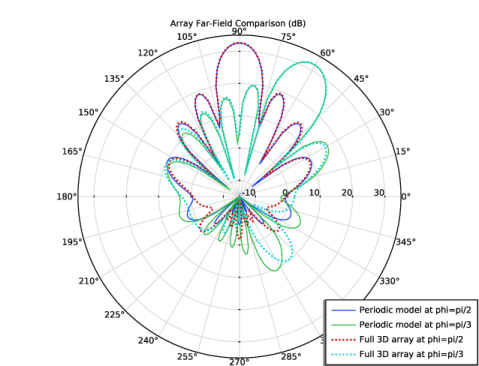 مقایسه در نمودار قطبی تطابق خوب بین مدل آرایه کامل و مدل ساده شده برای پرتو اصلی و برخی از لوب های جانبی را نشان می دهد.