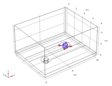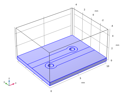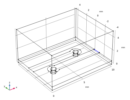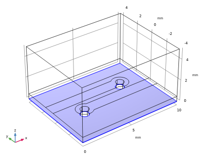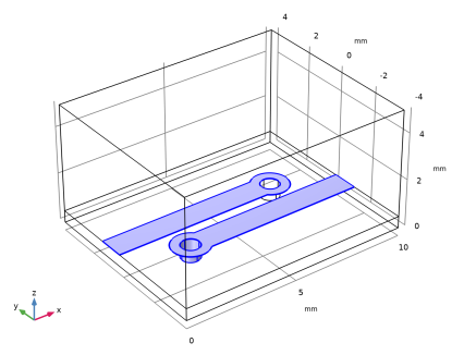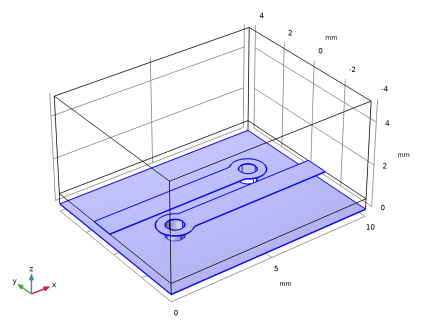 این مدل دو خط ریز نوار 50  Ω را در مجاورت یکدیگر بر روی یک بستر 60 میل با ثابت دی الکتریک ε r  = 3.38 توصیف می کند. یک خط میکرواستریپ با یک پورت توده ای نوع via خاتمه می یابد و خط دیگر با یک سوراخ از طریق متالیز شده به پایان می رسد. سطوح داخلی قطعات فلزی، از جمله خط طرحدار در بالای بستر و یک خط فلزی شده، با استفاده از یک شرط مرزی انتقالی تعریف میشوند تا تلفات ناشی از رسانایی محدود را ثبت کنند. صفحه زمین در سطح بیرونی دامنه مدل قرار دارد و با یک شرایط مرزی امپدانس مشخص می شود که برای مدل سازی مرزهای رسانای با تلفات نیز استفاده می شود.
