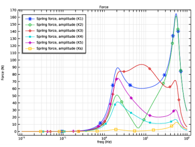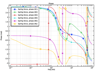 شکل 4 و شکل 5 دامنه و فاز نیروهای مختلف فنر در فرکانس های مختلف را نشان می دهد. می توان متوجه شد که دامنه نیروهای فنر در فرکانس های بالاتر نسبت به فرکانس های پایین بسیار بیشتر است.