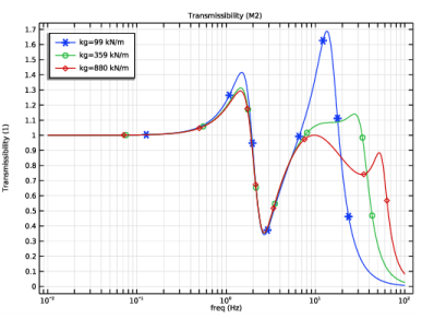شکل 6 طیف فرکانسی قابلیت انتقال جرم دوم را نشان می دهد. این نمودار قابلیت انتقال را برای سه خاک مختلف با مقادیر سختی متفاوت مقایسه می کند. مشاهده می شود که اولین پیک مربوط به اولین فرکانس طبیعی تقریباً تحت تأثیر قرار نگرفته است. با این حال، پیک دوم با کاهش سفتی خاک به سمت فرکانسهای پایینتر تغییر میکند.