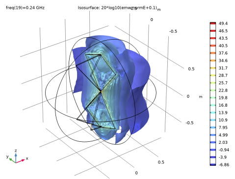 آنتن توسط یک حوزه هوای کروی محصور شده است. بیرونیترین لایههای حوزه هوا بهعنوان لایههای کاملاً منطبق (PML) پیکربندی شدهاند که تمام تشعشعات خروجی از آنتن را جذب میکنند و در طول شبیهسازی بهعنوان یک محفظه آنکویک کار میکنند.