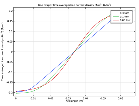 میانگین چگالی جریان یون زمانی در شکل 1 نشان داده شده است . حداکثر چگالی جریان یونی روی الکترودها با مقداری در حدود 0.2 A/m2 رخ می دهد . در فشارهای پایین تر، مشخصات چگالی جریان یونی در سراسر شکاف صاف تر است. در 300 mtorr یک صاف شدن آشکار چگالی جریان یونی در غلاف پلاسما وجود دارد. این نتایج به خوبی با نتایج ارائه شده در شکل 9 از مرجع مطابقت دارد. 1 .