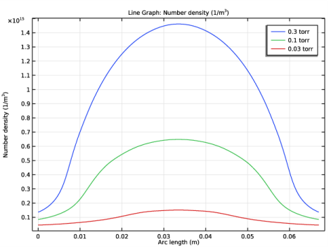 شکل 5 و شکل 6 میانگین دوره چگالی الکترون و یون را در فشارهای کاری مختلف نشان می دهند. چگالی الکترون و یون در توده پلاسما یکسان است اما چگالی یون در غلاف پلاسما بیشتر است. این یک چگالی بار فضایی مثبت خالص در غلاف پلاسما ایجاد می کند که تمایل دارد الکترون ها را در پلاسما نگه دارد و یون ها را از طریق پتانسیل پلاسما به سمت دیوار شتاب دهد.