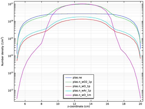 شکل 1 تا شکل 4 توزیع فضایی چگالی الکترون، دمای الکترون، چگالی یون منفی و توان جذب شده توسط الکترون ها در 1000 وات را نشان می دهد. توان جذب شده توسط الکترون ها و پروفایل های دمای الکترون نمونه ای از تخلیه ICP است. بیشتر رسوب توان در زیر سیم پیچ رخ می دهد و توسط پلاسمای متراکم بالا محافظت می شود و دمای الکترون در ناحیه پلاسما نسبتاً صاف است. چگالی الکترون و یون منفی دارای توزیع معمولی پلاسمای الکترونگاتیو با هسته الکترونگاتیو (جایی که الکترونها نیمرخ صاف دارند) و لبههای الکترومثبت (جایی که چگالی یون منفی به سرعت به سمت سطح کاهش مییابد) دارند. این مناطق را بهتر می توان در شکل 5 مشاهده کردکه توزیع گونه های باردار را در امتداد محور تقارن نشان می دهد.