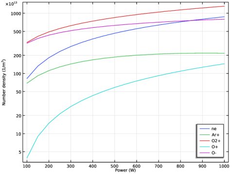 شکل 6 میانگین چگالی عدد فضایی گونه های باردار را به عنوان تابعی از توان نشان می دهد. در 100 وات یون های منفی گونه های بار منفی غالب هستند. با افزایش توان، الکترونگاتیوی تخلیه کاهش می یابد. در 1000 وات، الکترونگاتیوی متوسط کمی کوچکتر از یک است، و اکنون الکترون ها گونه های بار منفی غالب هستند. با این حال، همانطور که در شکل 5 نشان داده شده است، هسته الکترونگاتیو همیشه وجود دارد.