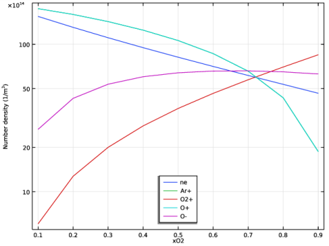 شکل 7 میانگین چگالی عدد فضایی گونه های باردار را به عنوان تابعی از کسر مولی اکسیژن نشان می دهد. با محتوای اکسیژن کم، تخلیه دارای الکترونگاتیوی کم است و O + یون مثبت غالب است. افزایش محتوای اکسیژن منجر به الکترونگاتیوی بالاتر و تغییر تدریجی یون مثبت غالب به O 2 + می شود .