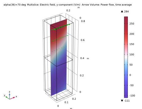 شکل 2: میدان الکتریکی، E y (برش) و جریان قدرت (فلش) برای بروز TE در 70 درجه در داخل سلول واحد.