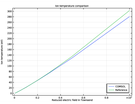 در این مثال، میانگین سرعت رانش گروهی از یونهای آرگون محاسبه شده و با دادههای تجربی مقایسه میشود. یونها با استفاده از رابط ردیابی ذرات شارژ شده مدلسازی میشوند. برخورد با گاز پسزمینه خنثی با استفاده از گره برخورد ، که از مدلهای برخورد تصادفی مختلف از جمله برخوردهای الاستیک و واکنشهای تبادل بار تشدید پشتیبانی میکند، اعمال میشود. میانگین سرعت رانش یون و دمای یون حاصل با مقادیر موجود در ادبیات مطابقت دارد.