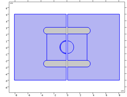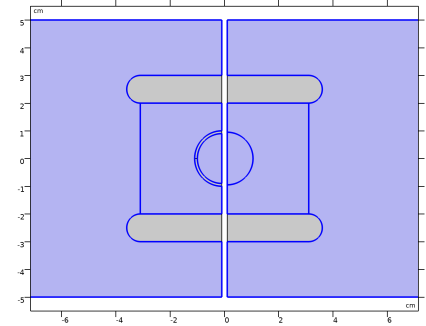 وضعیت مدل سازی شده در شکل 1 نشان داده شده است . دو صفحه موازی دارای یک ماده دی الکتریک بالا (گذردهی نسبی، ε r = 20 ) در بین آنها هستند و اختلاف ولتاژی روی آنها اعمال می شود و خازن را تشکیل می دهند. در داخل این ماده دی الکتریک، یک شکاف دایره ای 1 میلی متری ( ε r = 1 ) با قطر بیرونی 1 سانتی متر وجود دارد .
