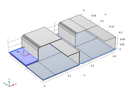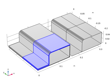 این مدل شامل یک لایه نیمه هادی مسطح به ضخامت 0.1 میلی متر است که بین دو پروفیل فلزی پیچیده شکل ضخیم تر قرار گرفته است. لایه زیرین از مس و لایه بالایی از آلومینیوم ساخته شده است. جریان بر روی یک ترمینال مربع در سطح بالایی لایه آلومینیوم اعمال می شود، در حالی که زمین بر روی سطح جانبی مس قرار می گیرد. هدایت الکتریکی نیمه هادی 1000 S/m است. یعنی به طور قابل توجهی کمتر از لایه های فلزی اتصال دهنده است. هدف محاسبه و مقایسه توزیع پتانسیل الکتریکی در لایههای مختلف، هم برای نمایش جامد و هم برای رویکرد پوسته لایهای است.