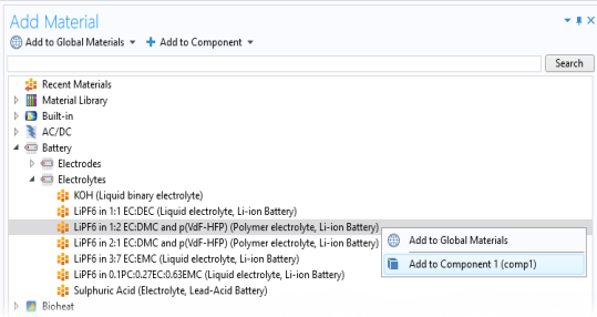 از کتابخانه مواد باتری برای تنظیم خواص مواد برای مواد الکترولیت و الکترود (آند و کاتد) استفاده کنید. با اضافه کردن مواد الکترولیت به مدل ابتدا، این ماده به ماده پیشفرض برای همه حوزهها تبدیل میشود.