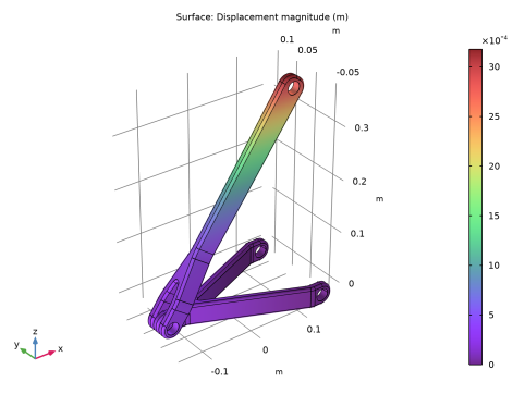 نیروی 1 کیلونیوتن در  جهت z در فاصله 10  سانتی متری در جهت منفی y  از مرکز سوراخ پین بالایی  اعمال می شود . جبران بار باعث ایجاد کشش و خمش عضو می شود.