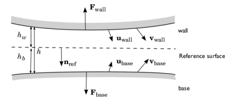 جایی که ρ چگالی سیال، μ ویسکوزیته آن، h 0 میانگین ارتفاع لایه، pf فشار ایجاد شده در نتیجه جریان ( این متغیر وابسته در COMSOL است) و tot فشار کل است ( tot  =   +  f ، که در آن A فشار محیط است). سایر اصطلاحات در شکل 1 تعریف شده است . یک سطح مرجع با ref معمولی در یک شکاف باریک بین دیوار و پایه قرار دارد. در COMSOL بردار refبه پایه و خارج از دیوار اشاره می کند. دیوار با جابجایی از موقعیت اولیه خود با جابجایی دیوار u و سرعت دیوار حرکت می کند . به طور مشابه، پایه از موقعیت اولیه خود با جابجایی پایه u و سرعت پایه حرکت می کند . فشردگی فیلم منجر به فشار اضافی، pf ، بالاتر از فشار محیط، A و سرعت گاز در شکاف می شود. در یک نقطه از سطح مرجع، مقدار متوسط ​​سرعت فیلم در امتداد یک خط عمود بر سطح توسط بردار در صفحه ave داده می شود.. حرکت گاز منجر به نیروهای وارد بر دیوار ( دیوار F ) و پایه ( پایه F ) می شود. ارتفاع دیوار بالای سطح مرجع h است در حالی که پایه یک فاصله b زیر سطح مرجع است. اندازه کل شکاف h=h +h b است . در یک نقطه معین از زمان =h w1 – ref · دیوار و =h b1 – ref · دیوار که در آن h w1 و b1 به ترتیب ارتفاعات اولیه دیوار و پایه هستند.