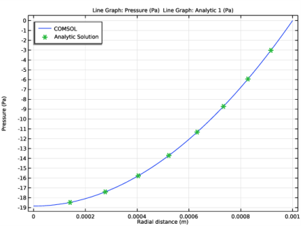 شکل 2: فشار فیلم در مقابل فاصله شعاعی از مرکز دیسک مدور. نتایج محاسبه شده توسط COMSOL به صورت منحنی پیوسته و نتیجه تحلیلی با نمادهای سبز نشان داده شده است.