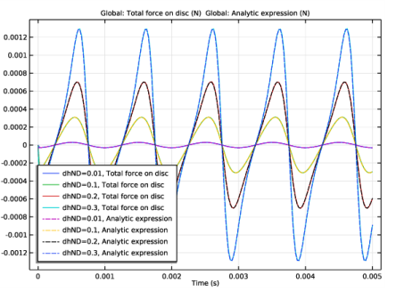 توافق بین نتیجه COMSOL و بیان تحلیلی خوب است. نیروی وارد بر دیسک به صورت دوره ای باقی می ماند اما در جابجایی های بزرگ نسبت به اندازه شکاف دارای مولفه های هارمونیک بالاتری است.