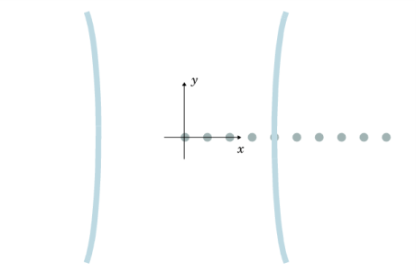 شکل 1 آرایه میله ها و پرتو گاوسی فرود را نشان می دهد. پرتو در جهت منفی y منتشر می شود  . طول موج 750 نانومتر و شعاع نقطه ای پرتو برابر با طول موج است. برای بحث دقیق تر در مورد پرتوهای گاوسی، مدل دومین نسل هارمونیک یک پرتو گاوسی را ببینید .