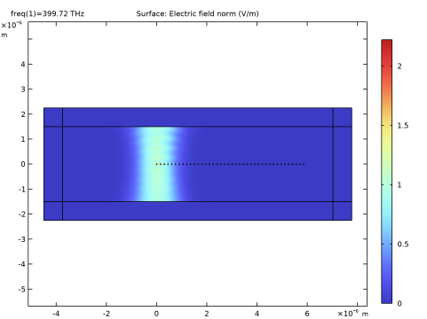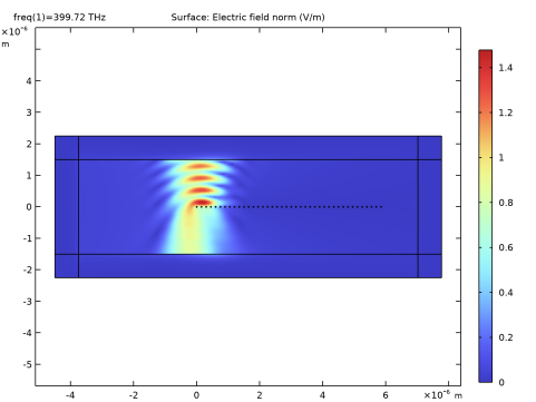 | 3 | در نوار ابزار Electric Field (ewfd) ، روی   Plot کلیک کنید  و نتیجه را با شکل 5 مقایسه کنید . بزرگنمایی نشان می دهد که نور توسط آرایه نانومیله مسدود شده است و نور توسط لبه آرایه پراکنده می شود. |