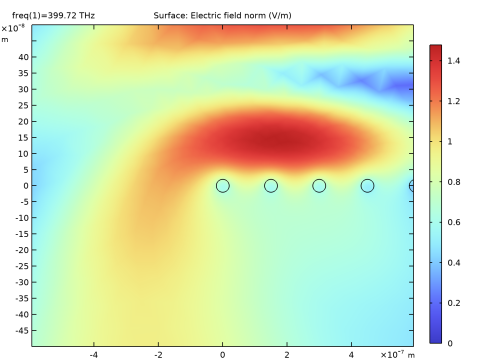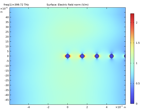 شکل 5: بزرگنمایی هنجار میدان الکتریکی برای مرکز پرتو گاوسی و چپ ترین نانومیله ها. پرتو نور گاوسی در امتداد میله ها (خارج از صفحه در جهت z) قطبی شده است.
