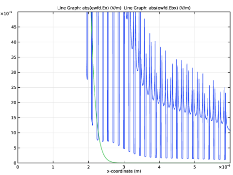 شکل 4: نمودار خطی مولفه x میدان الکتریکی (خط آبی) و میدان پس زمینه پرتو گاوسی (خط سبز). پرتو در جهت x قطبی شده است.
