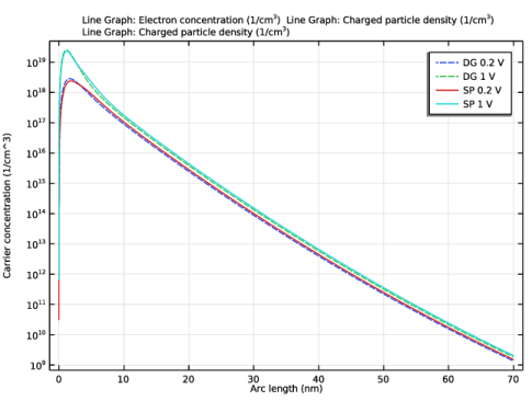 شکل 1 و شکل 2 پروفیل های چگالی الکترون را برای دو مقدار ولتاژ دروازه که توسط دو نظریه و در دو سطح مختلف زوم محاسبه شده است نشان می دهد. آنها به خوبی با شکل 4 (a) و 4 (b) در Ref مقایسه می شوند. 1 به ترتیب. تنها تفاوت در رفتار راه حل شرودینگر-پواسون است که افت ناگهانی را در کاغذ نشان می دهد اما در این مدل نه. افت فقط یک مصنوع است که به دلیل این واقعیت است که تعداد ناکافی توابع موج در شبیه ساز شرودینگر-پواسون در مقاله استفاده شده است.