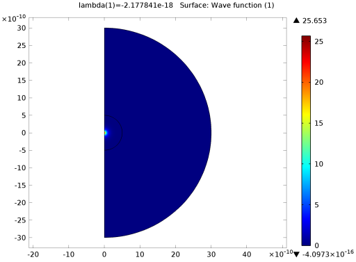 با پالایش مش و حل مجدد، می توانید به نتایج دقیق تری برسید. حالات با l = 0 مربوط به راه حل های کروی متقارن هستند، در حالی که حالت های با l = 1 یا 2 مربوط به حالت هایی با یک یا دو سطح گره شعاعی هستند. سطح انرژی 0 مربوط به انرژی الکترون آزاد است که دیگر محدود به هسته نیست. سطوح انرژی نزدیک به 0 مربوط به حالت های برانگیخته است.
