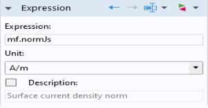 6 | از منو، Model>Component 1>Magnetic Fields>Currents and charge>mf.normJs – هنجار چگالی جریان سطحی را انتخاب کنید (هنگامی که نام متغیر را می دانید، مانند این تمرین، همچنین می توانید mf.normJs را مستقیماً در متن Expression وارد کنید . رشته). |