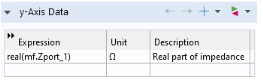 6 | به پنجره تنظیمات برای جهانی بروید. در زیر y-Axis Data در ستون Expression، real(mf.Zport_1) را وارد کنید . در ستون توضیحات، قسمت واقعی امپدانس را وارد کنید . ![]() |
