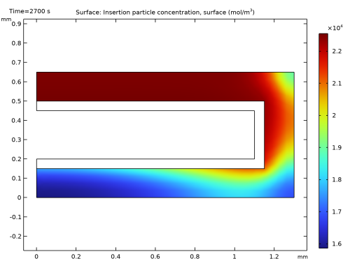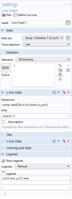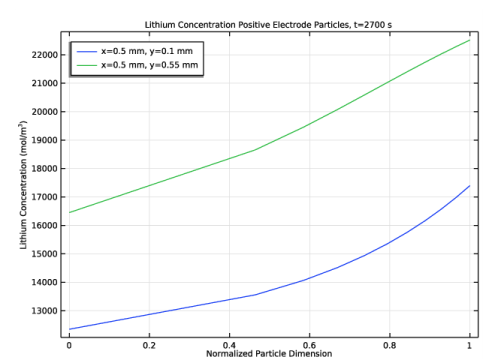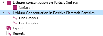 همانطور که قبلاً ذکر شد، گره ذرات درونی یک بعد اضافی به حوزه الکترود متخلخل اضافه می کند و غلظت لیتیوم جامد را در این بعد اضافی حل می کند. برای ایجاد نموداری از غلظت لیتیوم در ذرات در الکترود مثبت، ابتدا باید یک مجموعه داده Solution ایجاد کنید که به بعد اضافی اشاره دارد.