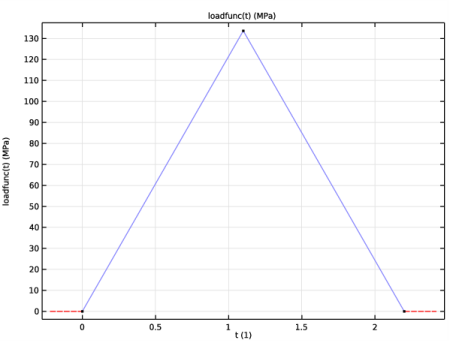 | • | لبه عمودی سمت راست تحت فشار قرار می گیرد که از صفر به حداکثر 133.65  مگاپاسکال افزایش می یابد و سپس آزاد می شود. مقدار پیک به گونهای انتخاب میشود که میانگین تنش بر روی بخش از سوراخ 10٪ بالاتر از تنش تسلیم باشد ( = 1.1 ·243· ( 20-10 )/ 20 ). رها شدن کامل تنش با مقدار پارامتر 2.2 مطابقت دارد، شکل 2 را ببینید . |