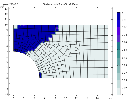 شکل 7 و شکل 8 مناطقی را نشان می دهد که در آن کرنش پلاستیک، پس از تخلیه، برای دو حالت مش مثلثی و چهار ضلعی رخ داده است. در این شکلها، مقدار یک به این معنی است که کرنش پلاستیک معادل بزرگتر از صفر است، و مقدار صفر به این معنی است که ماده در آن مکان بهطور خالص در طول فرآیند تغییر شکل داده است. در این مقایسه، تفاوتها بزرگتر به نظر میرسند، با این حال تفاوتها ناشی از شخصیت گسسته (صفر تا یک) خروجی، در ترکیب با تفاوتها در انواع عناصر مش و تفاوتها در توپولوژی است.