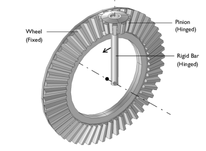 هندسه مدل در شکل 1 نشان داده شده است . دارای سه جزء است: چرخ، پینیون و میله سفت و سخت. چرخ و پینیون هر دو به عنوان چرخ دنده های مخروطی مدل سازی شده اند. چرخ در محل خود ثابت است. پینیون بر روی یک میله سفت و سخت از طریق یک مفصل لولا نصب می شود. میله سفت و سخت در نقطه ای که روی محور چرخ قرار دارد، لولا شده است.