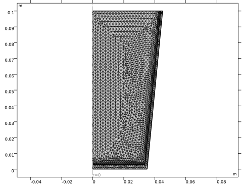 در ابتدا، لیوان و آب هر دو در دمای 5 درجه سانتیگراد هستند، گویی مستقیماً از یخچال گرفته شده اند. هوا و میز اطراف در دمای 25 درجه سانتی گراد ثابت نگه داشته می شود. دیوار شیشه ای دارای ضخامت محدود با هدایت حرارتی خاص است. با توجه به تقارن دورانی، میتوانید کل سیستم را به صورت دو بعدی و با استفاده از هندسه متقارن محوری مدلسازی کنید. هندسه و دامنه مدل در شکل 1 در زیر نشان داده شده است.