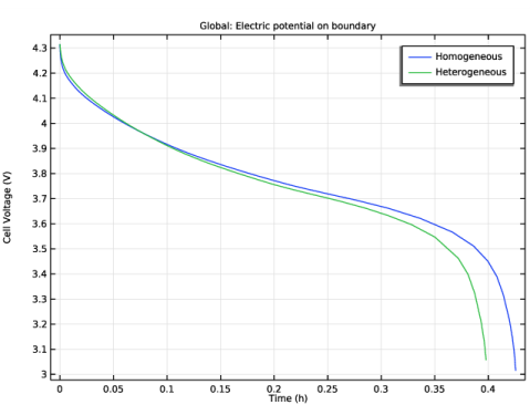 شکل 4 منحنی دشارژ 2C باتری را نشان می دهد و نتیجه را با مدل ناهمگن مقایسه می کند. ولتاژهای تخلیه حاصل از دو مدل به خوبی در طول تخلیه مطابقت دارند، جدا از قسمت نهایی تخلیه، که در آن محدودیت های انتشار لیتیوم درونی در بزرگترین ذرات مدل ناهمگن منجر به افت سریع ولتاژ تخلیه می شود. (افزایش پارامتر شعاع متوسط مدل همگن حدود 20 درصد باعث می شود که دو منحنی در این حالت کم و بیش همپوشانی داشته باشند.)