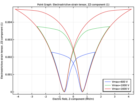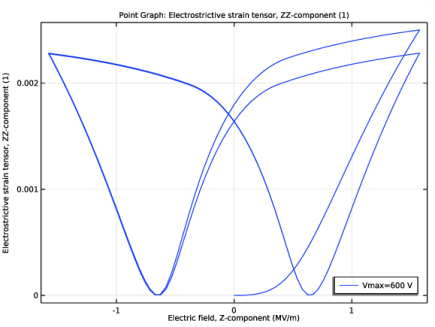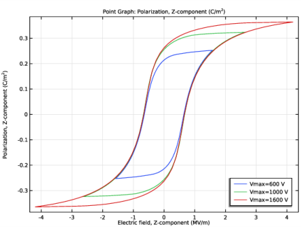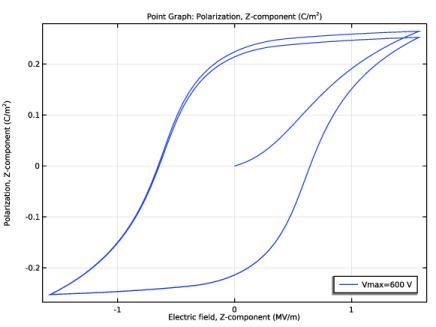 سه چرخه کامل برای هر مقدار V max محاسبه شده است . تغییرات پلاریزاسیون و کرنش الکترواستریکتیو در نقطه وسط محرک مورد مطالعه قرار گرفته است. چرخه اول شامل گذرای اولیه است. شکل 3 و شکل 4 را ببینید . حلقه های پسماند پس از دو چرخه کامل به طور کامل ایجاد می شوند. شکل 5 و شکل 6 را ببینید .