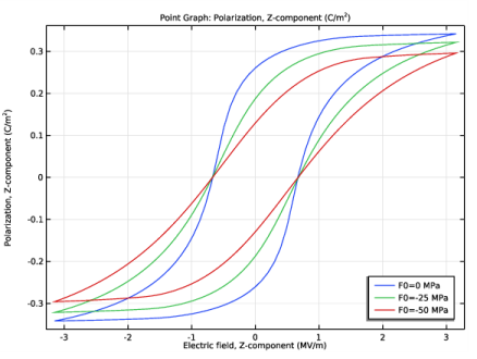 برای مواد فروالکتروالاستیک، بردار پلاریزاسیون تابع غیرخطی میدان الکتریکی و تنش مکانیکی احتمالی در ماده است. مدل Jiles-Atherton در COMSOL Multiphysics برای مدلسازی پسماند فروالکتریک موجود است. فرض بر این است که پلاریزاسیون کل را می توان به صورت مجموع قطعات برگشت پذیر و غیر قابل برگشت نشان داد. تغییر قطبش از معادله افزایشی زیر محاسبه می شود: