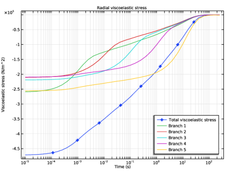 شکل 3: تغییر تنش ویسکوالاستیک. هر دو تنش کل و تنش در هر شاخه نشان داده شده است.
