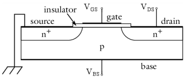 شکل 1: نمودار شماتیک یک ماسفت معمولی. جریان از منبع به گیت از طریق کانالی در زیر گیت جریان می یابد. اندازه کانال توسط ولتاژ گیت کنترل می شود.