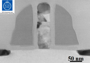 شکل 2: تصویر مقطعی TEM (میکروسکوپ الکترونی عبوری) از یک ماسفت گیت 50 نانومتری که در آزمایشگاه KTH Electrum توسط PE Hellström و همکارانش در پروژه تحقیقاتی OSIRIS پیشرفته ERC به سرپرستی پروفسور M. Östling ساخته شده است.