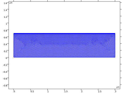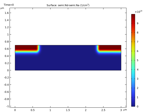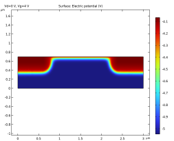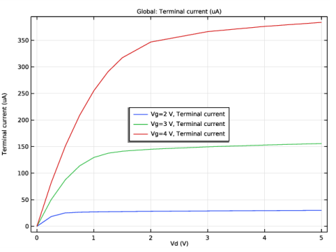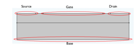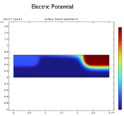 شکل 3 هندسه مدل را نشان می دهد که نشان می دهد چگونه عناصر هندسی با ویژگی های شکل 1 مطابقت دارند در این مدل هم منبع و هم پایه به زمین وصل شده اند و ولتاژهای اعمال شده به تخلیه و دروازه متفاوت است. در مطالعه اول یک ولتاژ کوچک ( 10  میلی ولت) به تخلیه اعمال می شود و ولتاژ دروازه از 0 تا 5  ولت جابجا می شود. نمودار جریان بین منبع و تخلیه برای تعیین ولتاژ روشن استفاده می شود. دستگاه مطالعه دوم ولتاژ تخلیه را از 0 تا 5  ولت در سه مقدار مختلف ولتاژ دروازه ( 2 ، 3، و 4) جارو می کند. V). سپس جریان تخلیه در مقابل ولتاژ تخلیه در چندین مقدار ولتاژ دروازه رسم می شود.