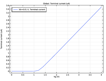 شکل 4 جریان تخلیه را در مقابل ولتاژ دروازه برای ولتاژ تخلیه ثابت 10  میلی ولت نشان می دهد. از نمودار مشخص است که ولتاژ آستانه، VT ، ترانزیستور تقریباً 1.2 ولت است. می  توان این مقدار را با مقدار نظری ارائه شده در Ref مقایسه کرد. 1 :