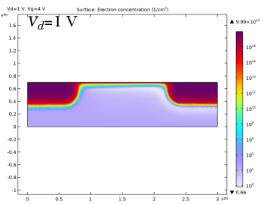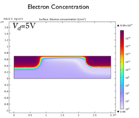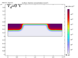 با نگاه کردن به غلظت الکترون در مقادیر Vd 0، 1 و 5 ولت، قطع شدن کانال به وضوح قابل مشاهده است.