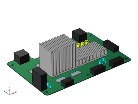 خود برد از یک ماده PCB عمومی ساخته شده است. هیت سینک ها از آلومینیوم ساخته شده اند. تراشه ها از سیلیکون ساخته شده اند. اتصال دهنده ها به صورت بلوک های مستطیلی ساخته شده از پلاستیک مدل سازی شده اند. برخی از خواص مواد موثر برای نشان دادن خازن ها استفاده می شود.