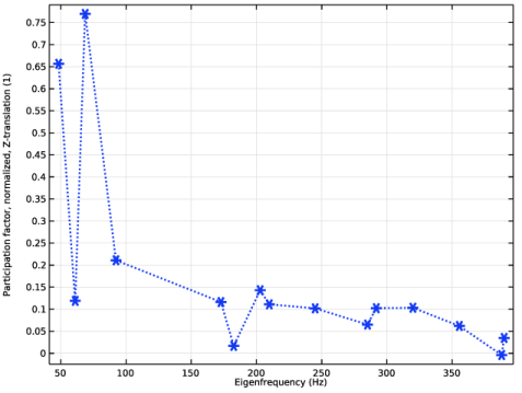 به عنوان اولین قدم، کمترین پانزده فرکانس ویژه محاسبه شده است. شکل 4 توزیع آنها را همراه با مقادیر فاکتورهای مشارکت برای حالت های ویژه مربوطه نشان می دهد.