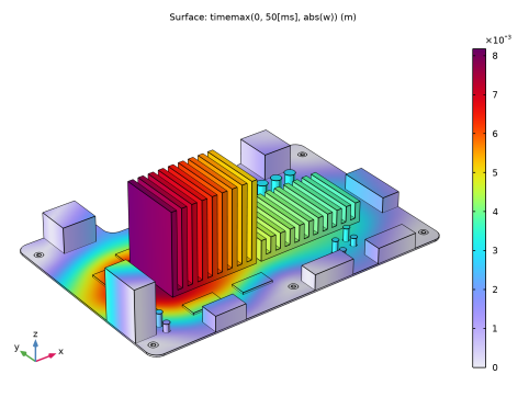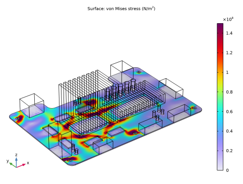 شکل 9 توزیع تنش محاسبه شده با استفاده از تحلیل طیف پاسخ را نشان می دهد. نمودار سطح استرس نسبتاً بالایی را در تراشه های حافظه نشان می دهد.