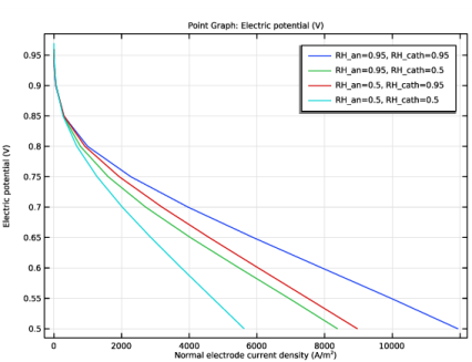 شکل 4 نمودارهای پلاریزاسیون (پتانسیل سلول در مقابل چگالی جریان سلول) را برای رطوبت های نسبی مختلف گازها در مرزهای GDL خارجی نشان می دهد. مرطوب شدن هر دو جریان گاز تا 95 درصد منجر به بالاترین جریان می شود. شکل همچنین نشان می دهد که مرطوب کردن آند تا 95% و کاتد تا 50% عملکرد بهتری نسبت به مرطوب کردن آند تا 50% و کاتد تا 95% دارد. رطوبت نسبی 50 درصد روی هر دو الکترود باعث بدترین عملکرد می شود.