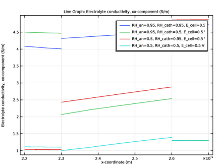 شکل 5 و شکل 6 فعالیت آب را برای سطوح مختلف رطوبت برای سلولی که در 0.5 ولت کار می کند و هدایت آینومر مربوطه را نشان می دهد. آند مرطوب شده تا 70% و کاتد تا 95% منجر به رسانایی غشاء بالاتری نسبت به مورد آند کاتد 95% -70% می شود، بنابراین تفاوت در عملکرد سلولی که در شکل 4 مشاهده می شود توضیح می دهد .