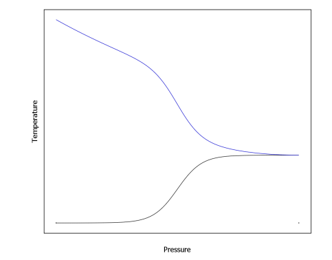 شکل 1: نمودار الکترون (آبی) و گاز (سیاه) دما در مقابل فشار. در فشارهای بالاتر، دو دما برابر می شوند.