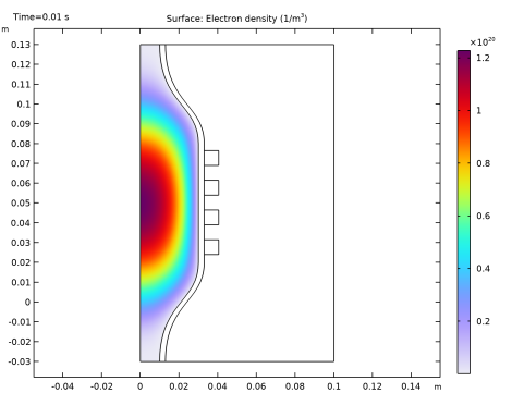 چگالی الکترون و انرژی متوسط الکترون با حل یک جفت معادله رانش- انتشار برای چگالی الکترون و انرژی الکترون میانگین محاسبه میشود. برای اطلاعات دقیق در مورد انتقال الکترون، به نظریه برای رابط انتشار رانش در راهنمای کاربر ماژول پلاسما مراجعه کنید .