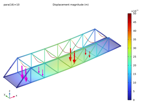 شکل 2 و شکل 3 تغییر شکل پل را تحت بار کامیون و بدون بار نشان می دهد. شکل 2 جابجایی های تحت وزن خود را نشان می دهد و مشاهده می شود که حداکثر انحراف در جاده به 2.5 سانتی متر می رسد. شکل 3 حداکثر جابجایی 3 سانتی متری در جاده را با وزن خود و بار کامیون نشان می دهد. شکل موقعیت دو کامیون (فلش های بار) را در زمانی که حداکثر جابجایی رخ می دهد نشان می دهد.
