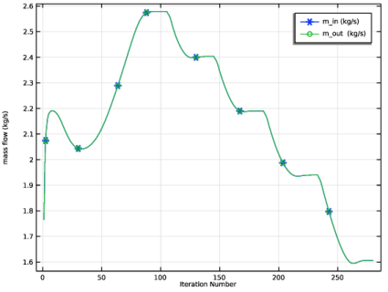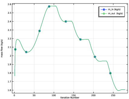 جریان جرمی توسط دو قطعه پروب، یکی در ورودی و دیگری در خروجی کنترل می شود. شکل 2 نشان می دهد که جریان جرمی در ورودی و خروجی برابر است، به این معنی که بقای جرم حاصل می شود.